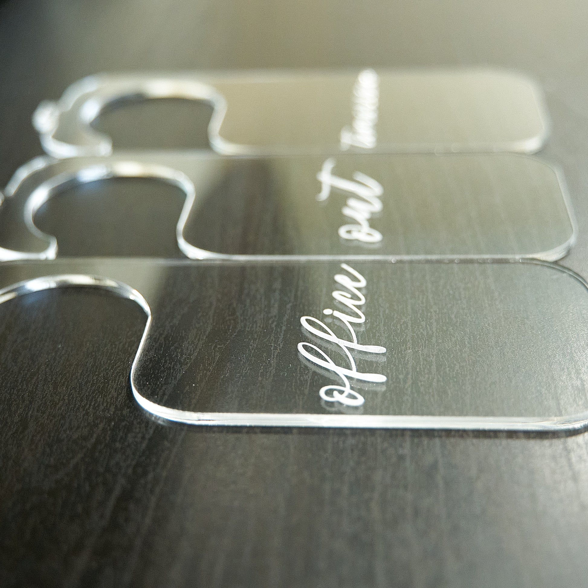 Looking for a stylish and personalized way to organize your closet? Look no further than these Custom Cursive Acrylic Hanger Dividers from Abbott Laser! Made from high-quality 1/4 inch acrylic and laser engraved with a minimalist cursive font, these hanger dividers are the perfect way to add a touch of sophistication to any closet. Plus, with custom name personalization, you'll always know exactly where to find your favorite items.