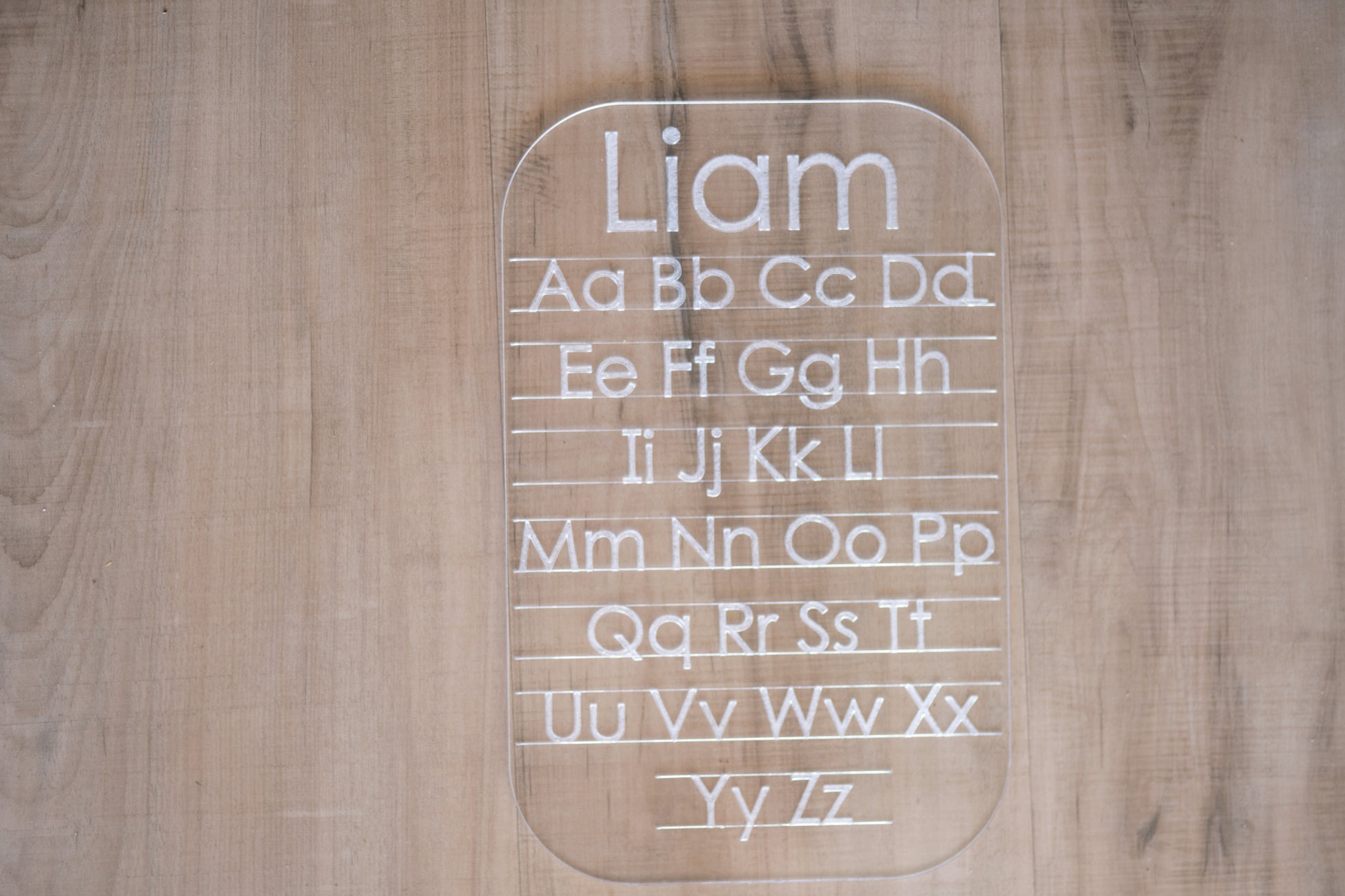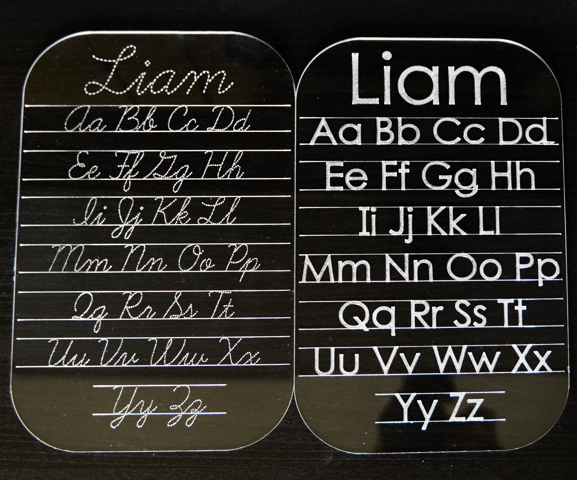 Our tracing boards are engraved on the back, so your child can practice tracing their letters and name with a dry-erase marker. When they're finished, just wipe it off and start again for endless learning and fun! Available in both normal and cursive handwriting.